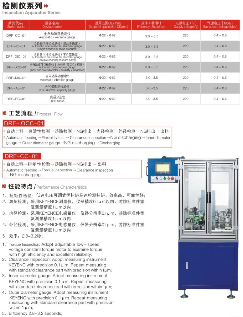 各類檢測(cè)儀系列:包含全自動(dòng)游隙檢測(cè)儀_內(nèi)外徑檢測(cè)儀_多項(xiàng)目檢測(cè)儀_振動(dòng)檢測(cè)儀_外徑橢圓度檢測(cè)儀_內(nèi)徑分選儀等等,低速電壓可調(diào)式恒扭矩馬達(dá)檢測(cè)扭矩,效果高可靠性好,游隙標(biāo)準(zhǔn)件重復(fù)測(cè)量精度1微米以內(nèi),效率2.8-3.2秒