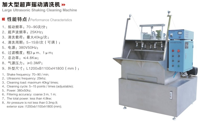 加大型超聲搖動清洗機特點搖動頻率70-90次/分,超聲波頻率25KHz,清洗載荷最大40Kg/次,清洗周期5-15分/次,氣源壓力>=0.3Mpa