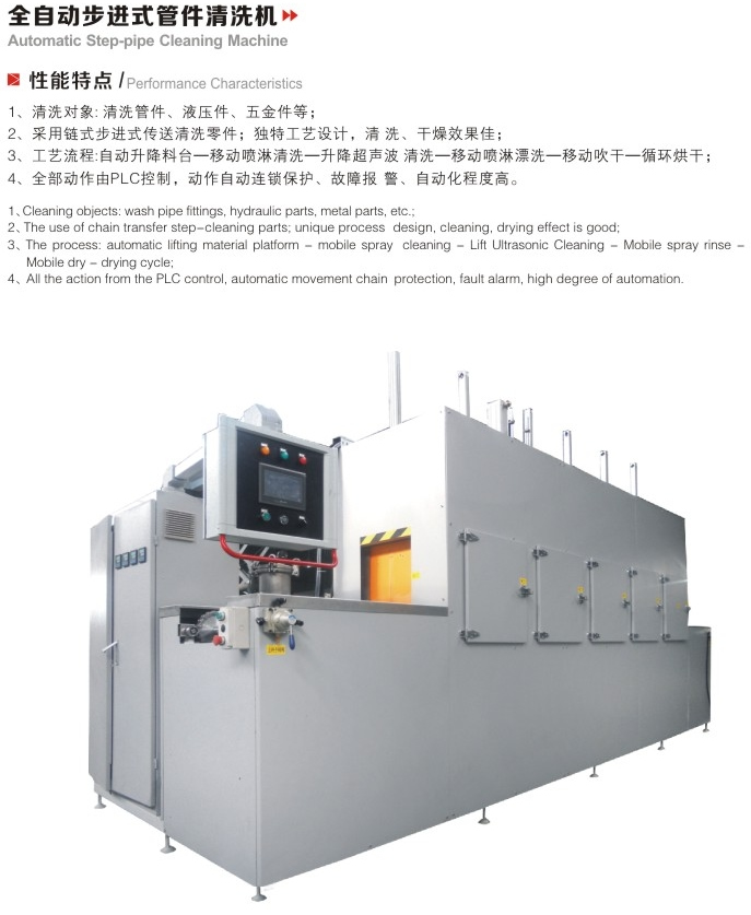 全自動(dòng)步進(jìn)式管件清洗機(jī)主要清洗對(duì)象:清冼管件、液壓件、五金件,采用鏈?zhǔn)讲竭M(jìn)式傳送清洗零件,獨(dú)特工藝設(shè)計(jì),清洗、干燥效果佳,全部動(dòng)作由PLC控制,動(dòng)作自動(dòng)連鎖保護(hù)、故障報(bào)警、自動(dòng)化程度高
