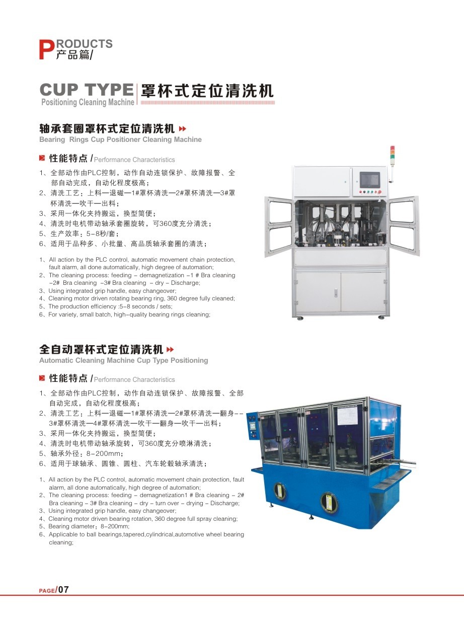 全部動作均有PLC控制,動作自動連鎖保護、故障報警提示、自動化程度高;清洗工藝:上料-退磁-1#罩杯清洗-2#罩杯清洗-3#罩杯清洗-4#罩杯清洗-吹干-翻身-吹干-出料;采用一體化夾持搬運,換型簡便;清洗時電機帶動軸承套圈旋轉(zhuǎn),可360度充分清洗;軸承外徑:8-200mm,適用于球軸承、圓錐、圓柱、汽車輪轂軸承清洗