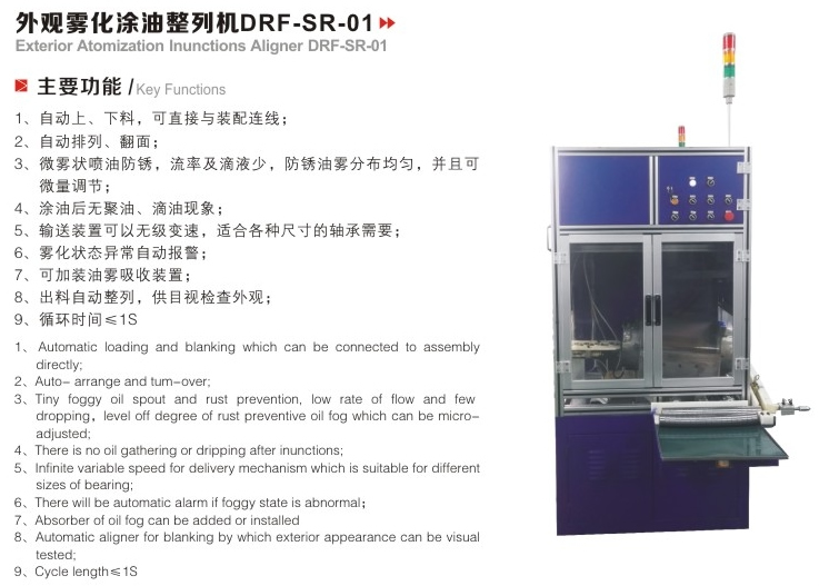 外觀霧化涂油整列機可自動上、下料,可直接與裝配連線,自動排列、翻面,微霧狀噴油防銹及滴液少,防銹油霧分布均勻,并且可微量調節(jié),涂油后無聚油、滴油現(xiàn)象,輸送裝置可無級變速,適合各種尺寸的軸承需要,霧化狀態(tài)異常自動報警,可加裝油霧吸收裝置,出料自動整列,供目視檢查
